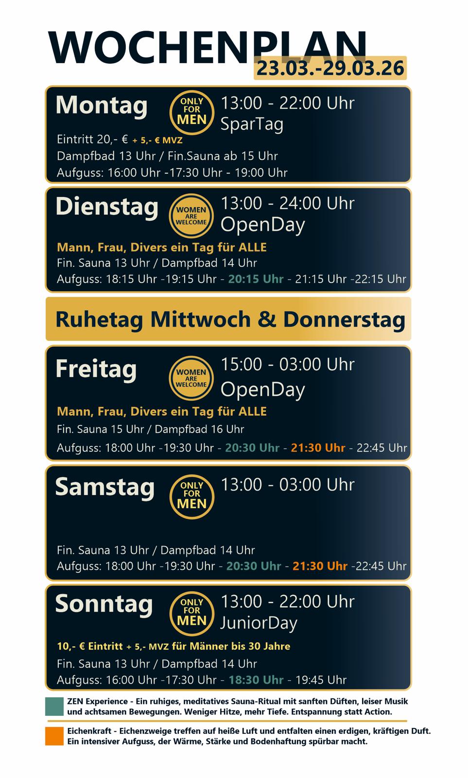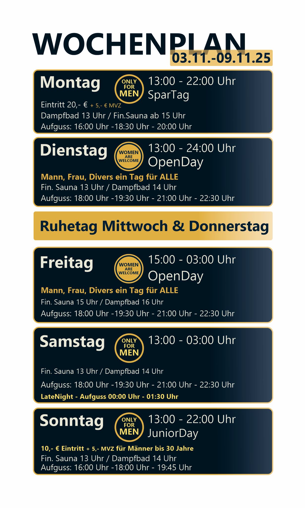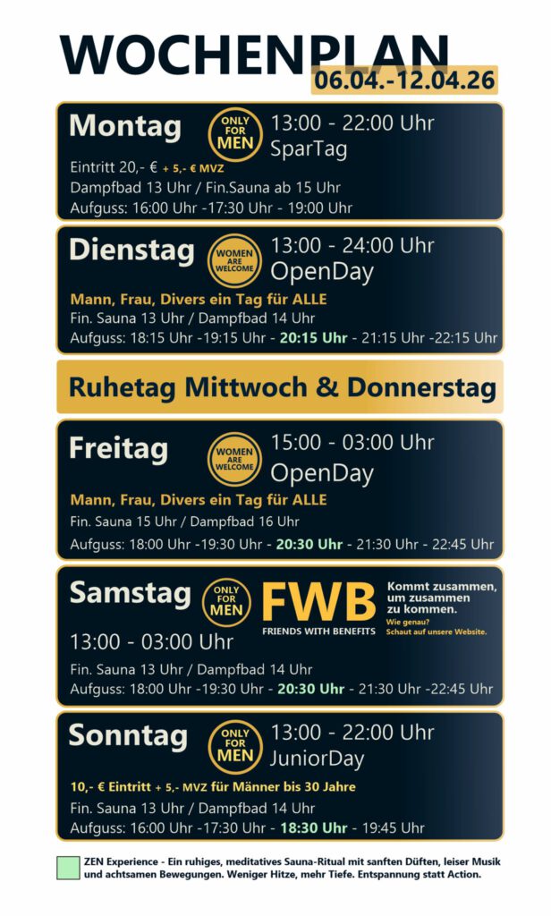 Nach dem Check-in erhältst du einen Spind und kannst die Sauna, Dampfbäder, Ruhezonen und den Barbereich frei nutzen. Events & Aufgüsse sind inklusive, solange nicht anders angegeben.