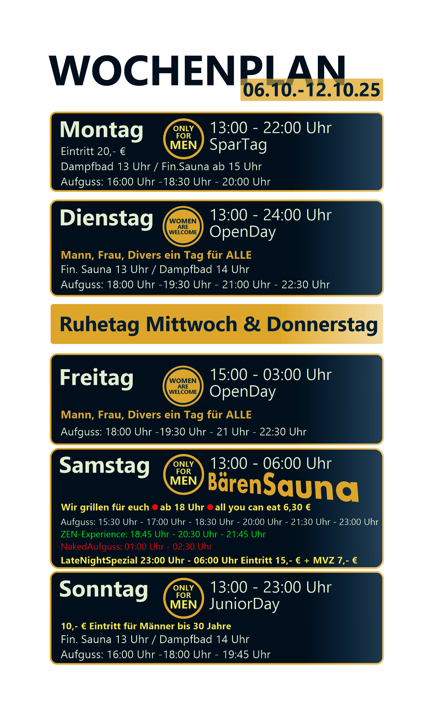 After check-in, you receive a locker and can freely use the sauna, steam baths, relaxation zones, and bar area. Events & infusions are included, unless otherwise stated.